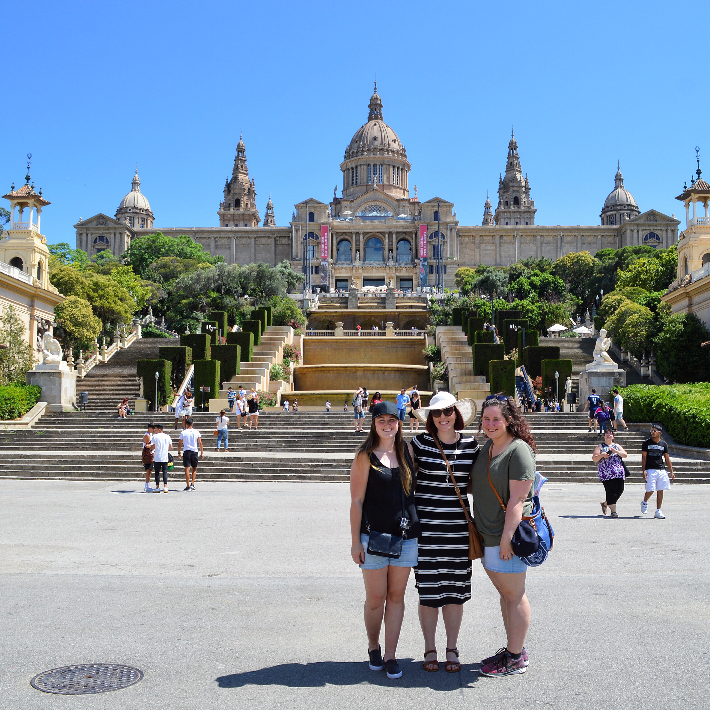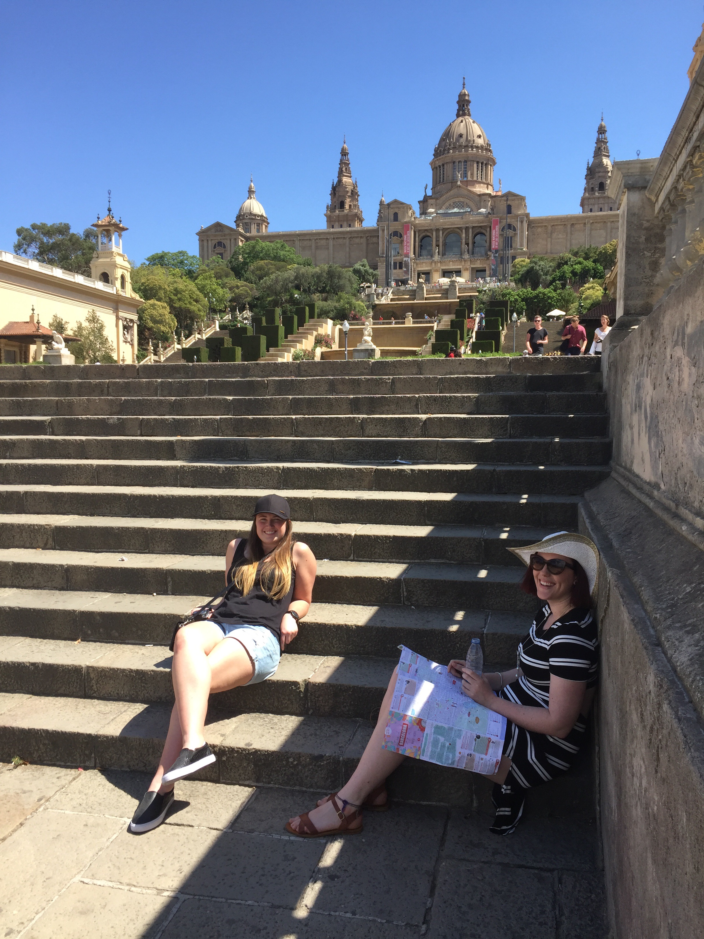 After the tour concluded our guide Filipa was lovely enough to take us and a few other members of our tour to Tapas Bar Pulperia for el menu del dia i.e. “menu of the day” – pretty much a menu from 12-3 where you get 2 main courses, a drink and a desert for ~10-25 euros (and it was delicious). It was nice to sit, chat, have banter with the waiters as we all tried to figure out exactly what some translations would be and enjoy some good food! After attempting (and failing due to the insane lines) to go to the Picasso museum, we tried to find where we had to go to ride the cable car which offered resplendent views of Barcelona and the harbor. Tried being the key word. Unfortunately when trying to ask for directions we were misunderstood and ended up at a apparently the second cable car in Barcelona. Luckily for us it just so happened to be at Parc de Montjuïc. We emerged for the metro (incredibly confused as to our location) to a beautiful view of the Museu Nacional d’Art de Catalunya-MNAC. After running around and taking a million photos, re-orientating ourselves and finding some shade (man it can be hot!) we headed off through the park to do some exploring. We found lush greenery, cute little ponds, were senenaded with some jazz tunes and a guy dancing alone to …. I think only he knew what. When we did ACTUALLY find the cable car there was a super long wait (anyone sensing a pattern here about Barcelona and their lines???) so we sat for a while and enjoyed the beautiful view before making our decent down through the park for our next adventure – tapas and flamenco!