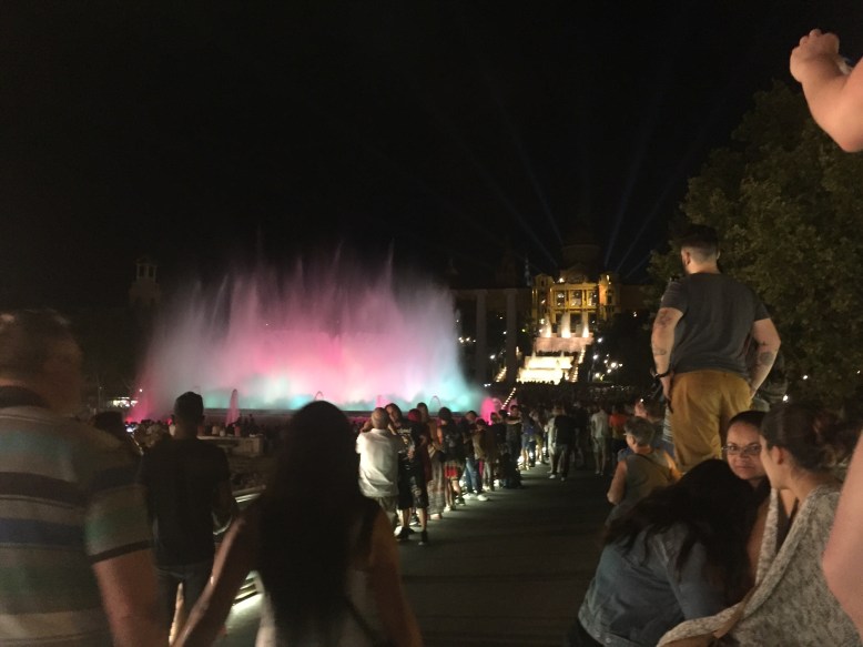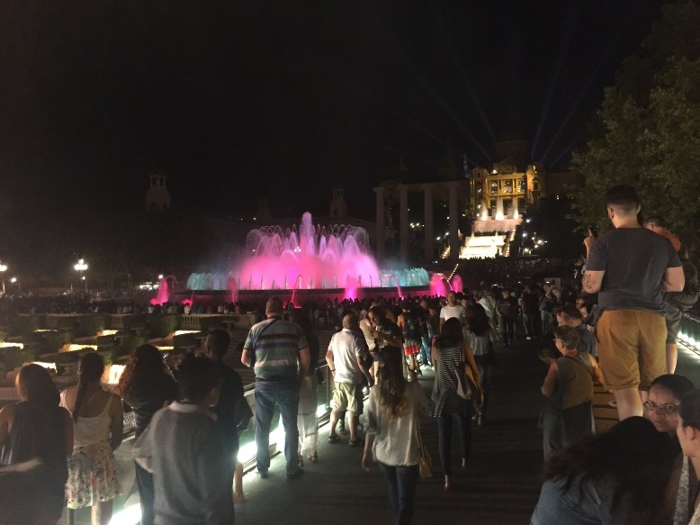 As we had enjoyed some not-so-delicious tapas (awful prawns and everything else was a bit odd too) near the Sagrada Família while we waited for our entrance time, we grabbed a bite for dinner at our hostel and then headed out for one more destination – the Magic Fountain of Montjuïc. It was a spectacular display of colour, light, motion, music and water acrobatics – magic! I would highly recommend this for any trip to Barcelona, it was such a pleasure to sit with two friends, and watch some magic, the world and a whole bunch of people go by.
