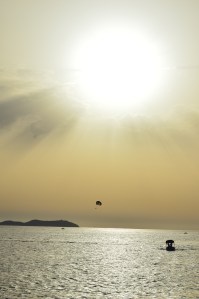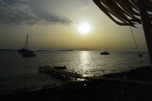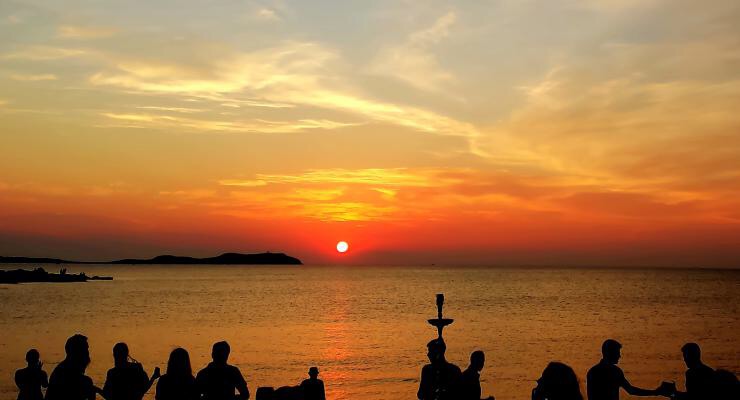 Ibiza’s famous sunset strip has an array of bars, lounges and restaurants where you can sit by the shores of the bay of Caló des Moro and admire the stunning sunsets over the Mediterranean Sea and enjoy some food and drinks to a backdrop of ambient music. Café del Mar is the most well-known of these establishments and was the first to open its doors in 1980. It is a beautiful restaurant, designed by well known Catalan architect Lluis Géell the bar adopts the look of a yacht with sail like coverings which house a seating area and beautiful bar. Because of this you 100% need to book in advance (and there is a minimum spend at all of the restaurants) so we went to a lesser know place called FRESH. To stretch out our time at FRESH and to hold our beach front table (despite our earlier cufuffle we had still arrived 3 hours before the sunset – however the place was pretty packed 2 hours before) we ordered a series of nachos/starter plates and sangria/cocktails. Everything was delicious and the waiters were lovely, commenting “we run like chickens without heads” when apologising for the delay in service when they became very busy. There was just one more hiccup – there was haze. This was the sunset we were promised….