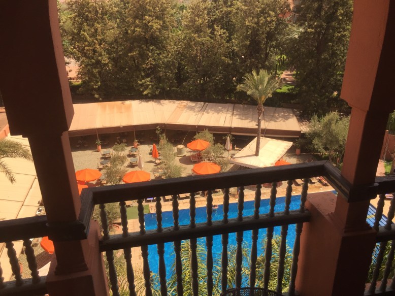 Landing safely in Morocco (although there was no clapping this time) we were thrilled! Coasting through security and getting our bags with a breeze, we skipped out the door. But where was out ride? Fear struck instantly and though it was probably only a few moments, before we saw him (not very enthusiastically holding a Bus About sign up in the back row of drivers) it was long enough for a small panic attack each. Told we had two more people to wait for, we took a seat in the outdoor waiting room type area. 45 minutes elapsed during which we started trying to guess which two people were for us and trying telepathically to convince each pair we saw to walk over to the driver (clearly becoming more delirious with the heat). Partially doing this to kill the time and partially because our driver did not seem enthused at all and was not holding his sign very visibly. Convinced it was the boy/girl pair on our tour we started judging everyone we came across, would they be fun, would we want them on our tour, could we convince them to be on our tour so we could just get to the hotel already? You know, logical thoughts. Eventually we got a ride to the hotel with 3 lovely girls who were doing the 8 day tour but for some reason were not on any list. No idea what happened to the pair we were waiting on…the guy with the sign stayed behind for them…Hôtel El Andalous was heaven. So much fancier than we anticipated. Lush double beds each, terrific air conditioning, a terrific looking pool, 3 different dining areas and more. Once we settle in the room we needed some food and went downstairs to ask the concierge. She directed us to this lounge that felt like a huge study. Abundant leather couches, wooden tables and Moroccan tiles and we had it all to ourselves! After chowing down on some food (nomnomnom) we had a swim in the pool which was almost too warm. Not quite yet the Morocco we had expected.