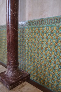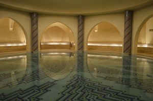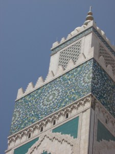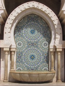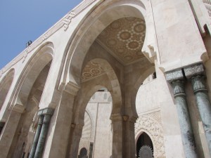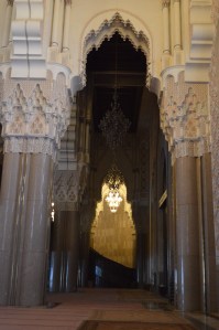 The Hassan II Mosque is the world’s third-largest mosque, the largest inMorocco, built to commemorate the former king’s 60th birthday. The mosque (and its 210m minaret) rises above the ocean on an outcrop northwest of the medina, and holds 25,000 worshippers and a further 80,000 in the squares around it. It is truly an impressive sight, such a large and decorated building with the ocean as a backdrop. We ran around trying to take it all in and snapping some beautiful photos long the way. To be able to see the stunning inside of the mosque you must go on a guided tour, so we headed in to meet our group. Awe-inspiring is the only was to describe it. There is so much detail everywhere that you look, it is hard to take it all in at once. As we walked around gawking at all the hand-made work and vast space, our guide told us details about the mosque and its operations. It was made in approximately 7 years, is estimated to have cost as much as $800 million, and around 1,400 men worked by day and 1,000 worked by night to bring the vast project to completion. There is an automated sliding roof opens (on special occasions) to the heavens (and the weather). Nearly all the materials of the Hassan II Mosque are from Morocco, with the sole exceptions of the imported white granite columns and glass chandeliers (from Murano, near Venice). The marble is from Agandir, the cedar wood is from the Middle Atlas and the granite comes from Tafraoute. Over 6,000 Moroccan master craftsmen and artisans were employed to work these local materials into the intricate decorations that embellish the entire structure.