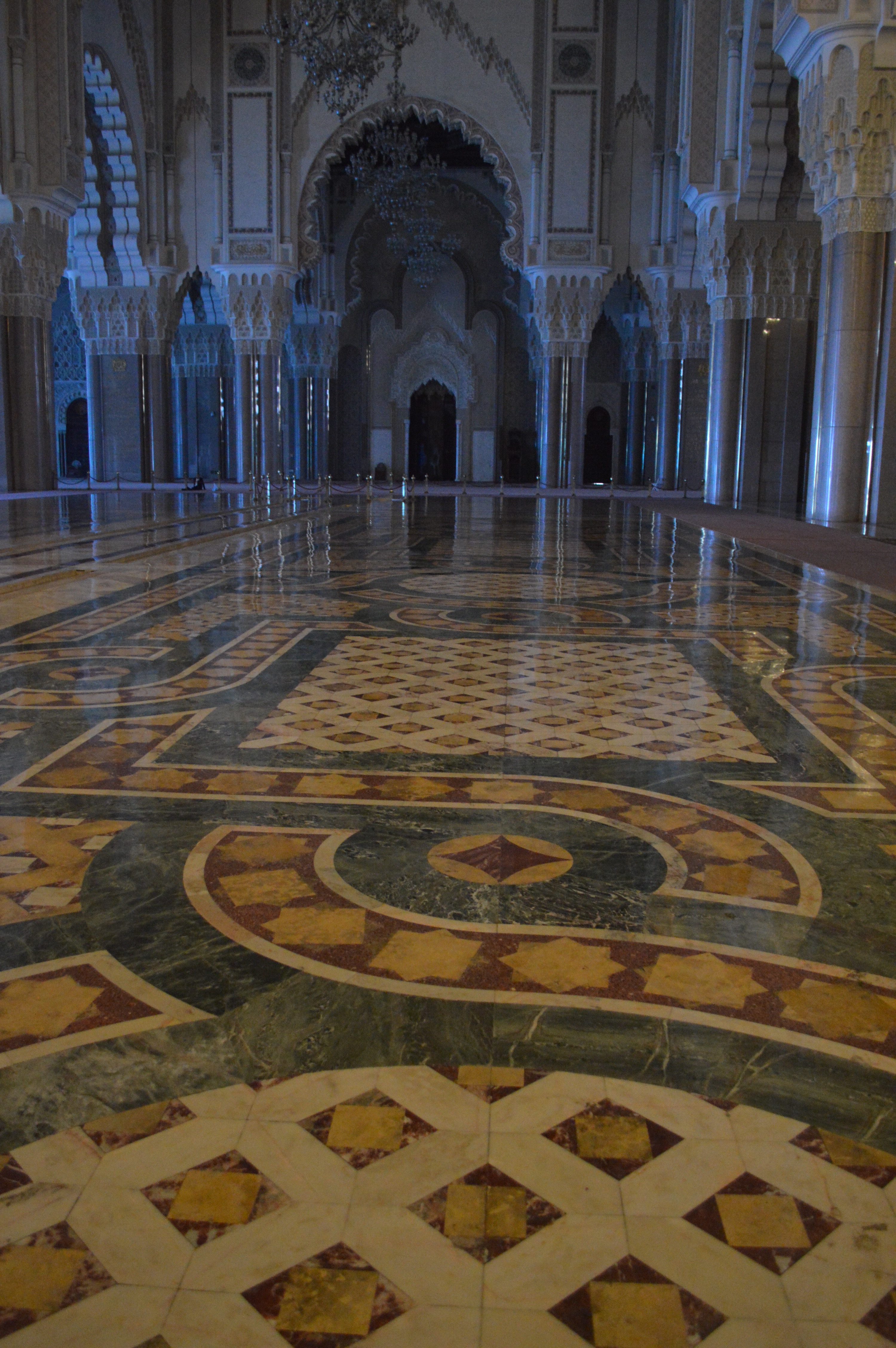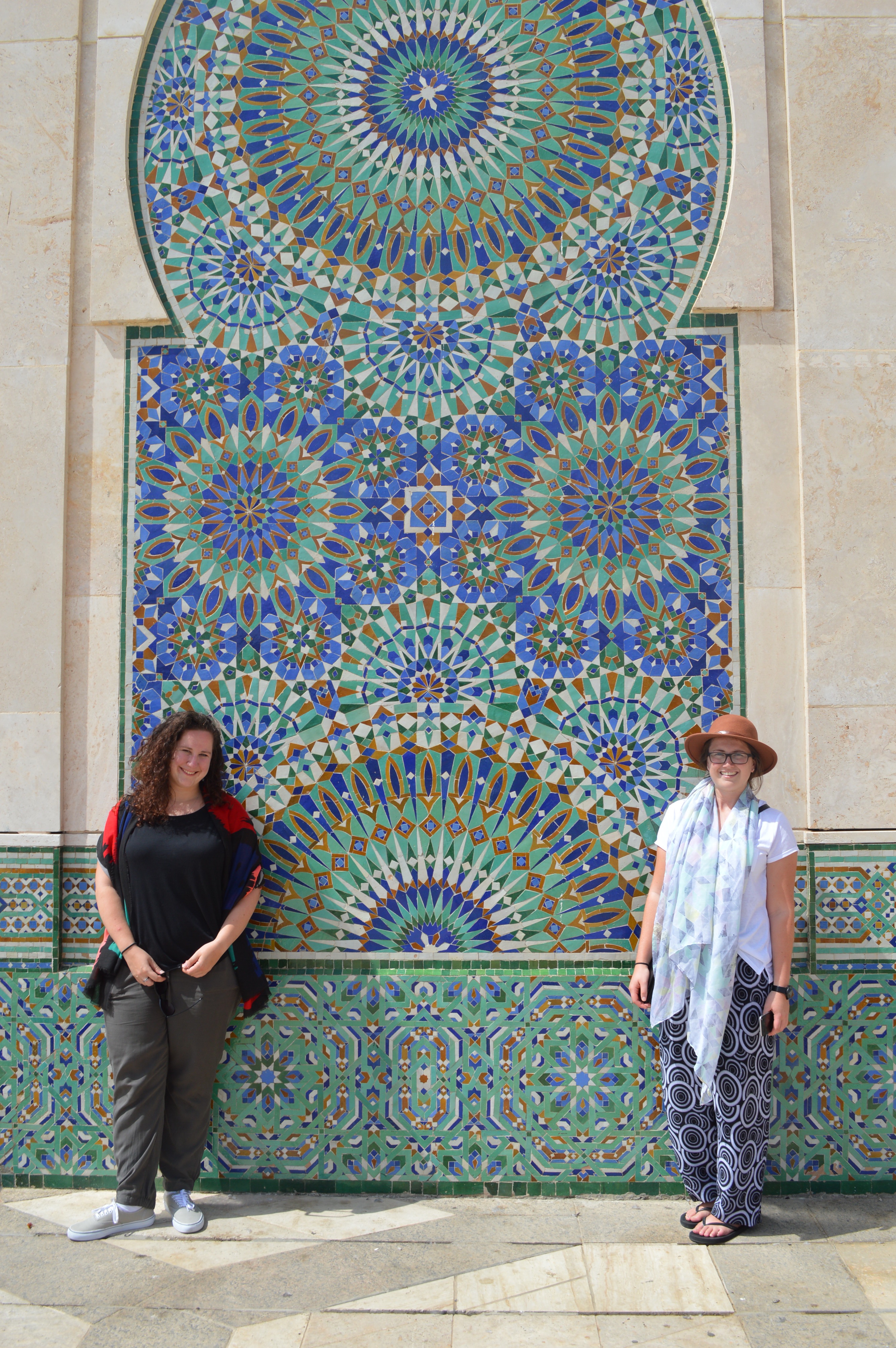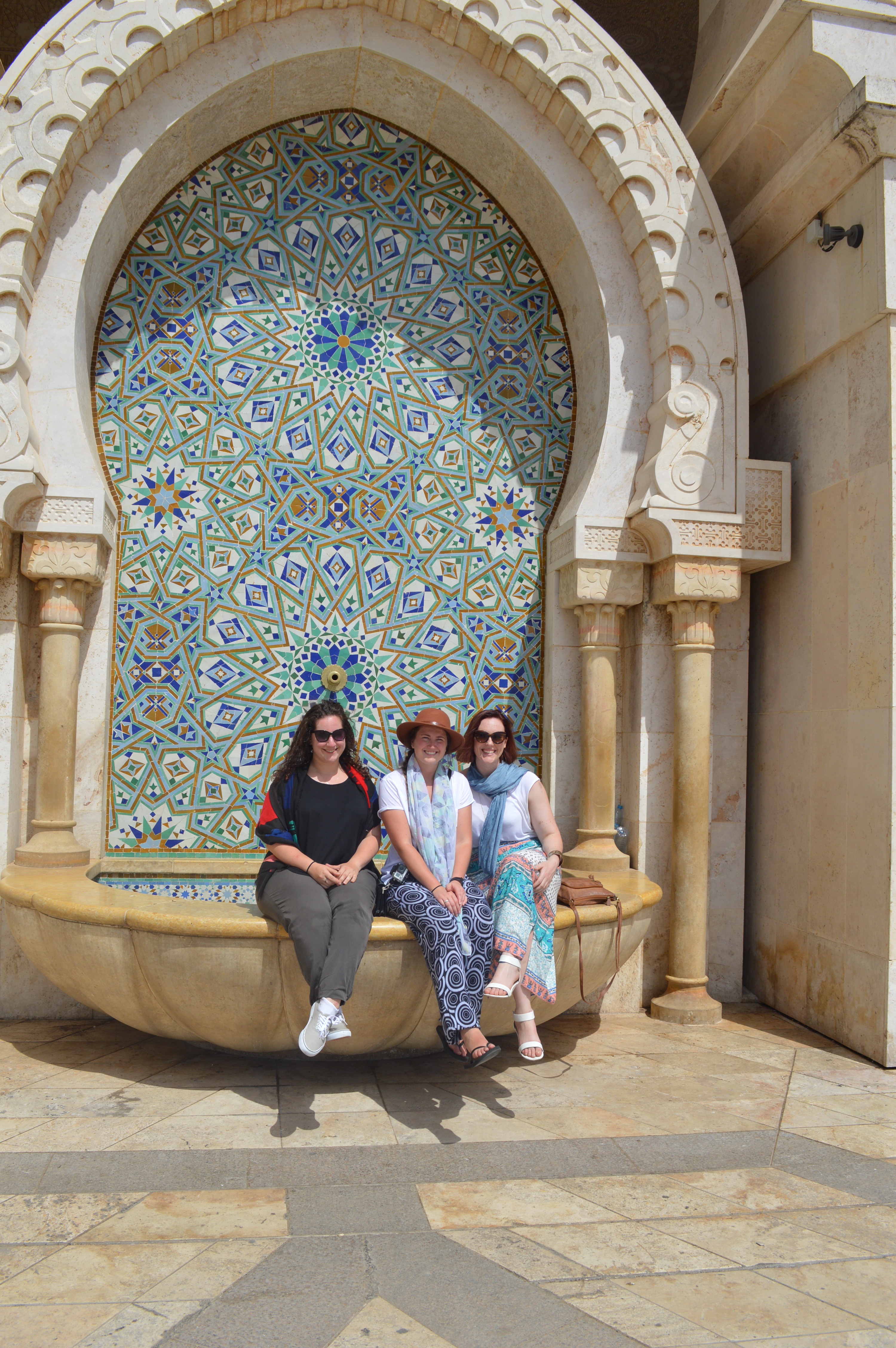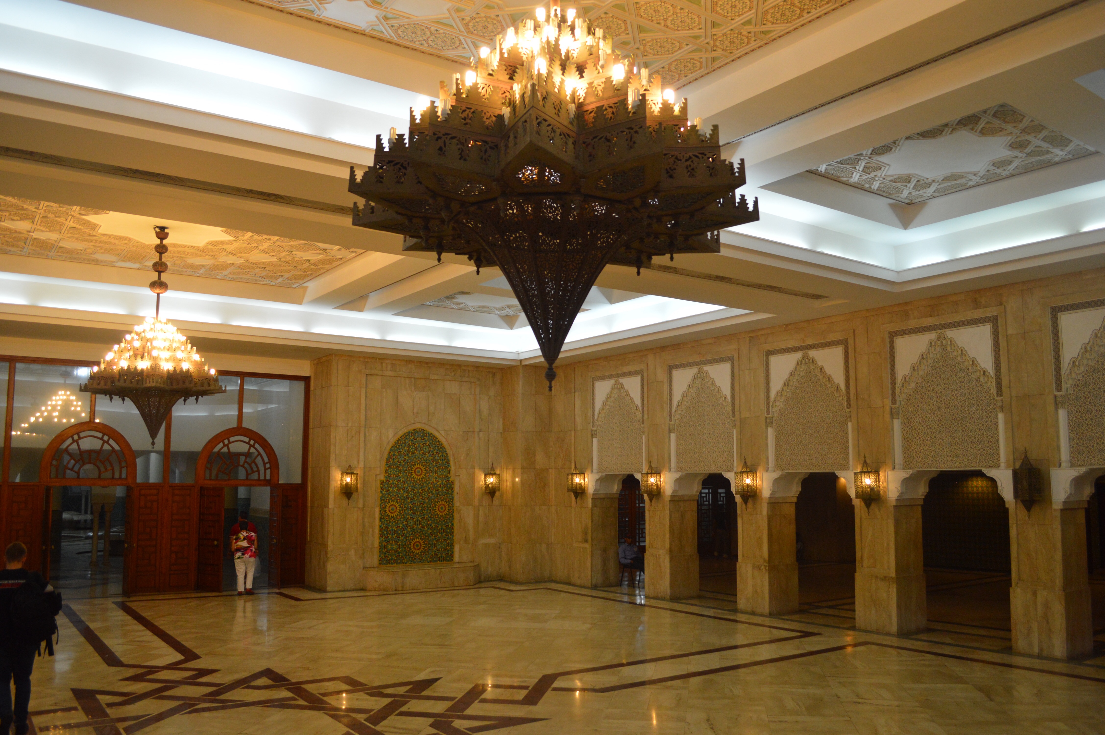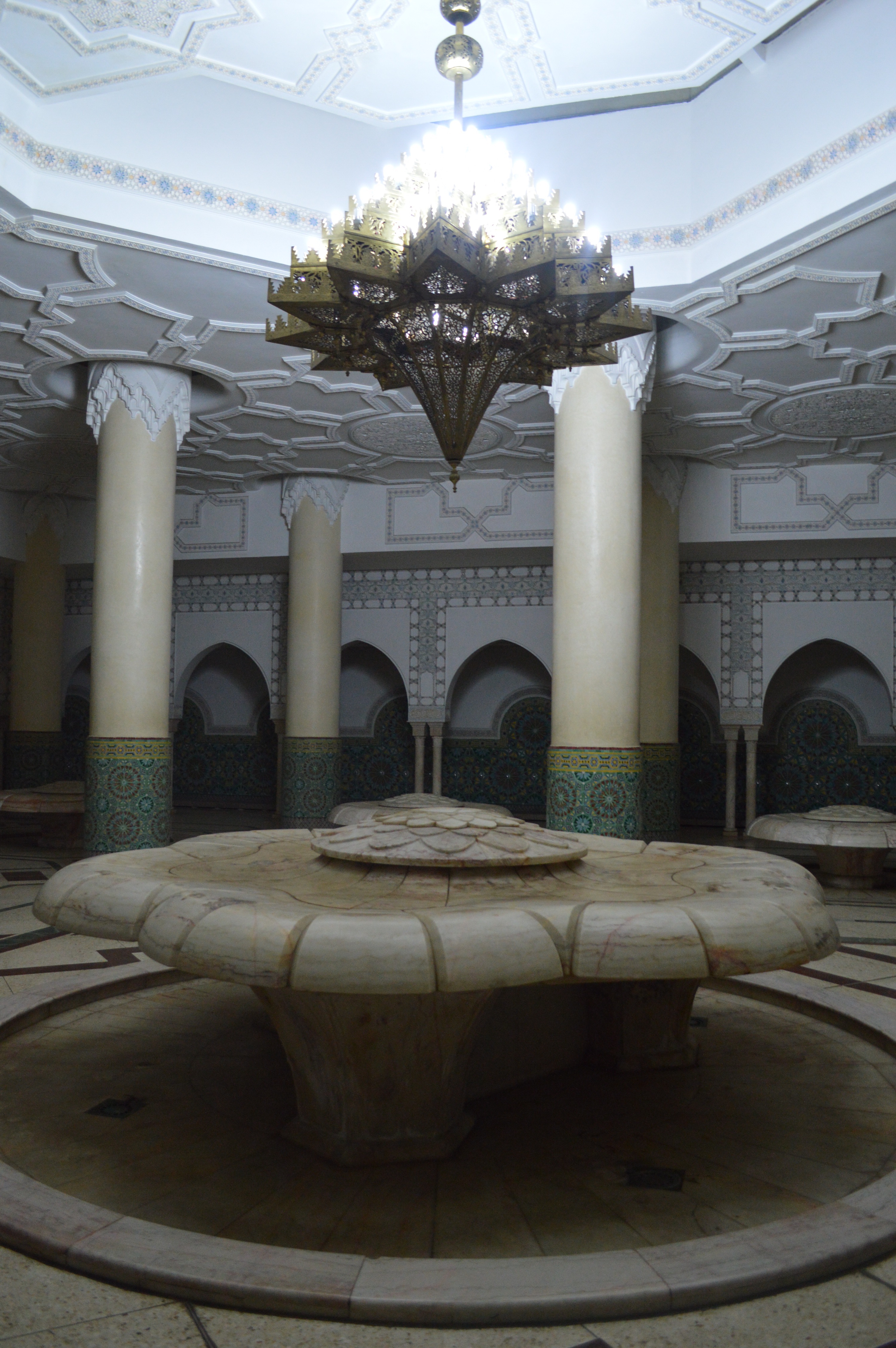 The Hassan II Mosque is the world’s third-largest mosque, the largest inMorocco, built to commemorate the former king’s 60th birthday. The mosque (and its 210m minaret) rises above the ocean on an outcrop northwest of the medina, and holds 25,000 worshippers and a further 80,000 in the squares around it. It is truly an impressive sight, such a large and decorated building with the ocean as a backdrop. We ran around trying to take it all in and snapping some beautiful photos long the way. To be able to see the stunning inside of the mosque you must go on a guided tour, so we headed in to meet our group. Awe-inspiring is the only was to describe it. There is so much detail everywhere that you look, it is hard to take it all in at once. As we walked around gawking at all the hand-made work and vast space, our guide told us details about the mosque and its operations. It was made in approximately 7 years, is estimated to have cost as much as $800 million, and around 1,400 men worked by day and 1,000 worked by night to bring the vast project to completion. There is an automated sliding roof opens (on special occasions) to the heavens (and the weather). Nearly all the materials of the Hassan II Mosque are from Morocco, with the sole exceptions of the imported white granite columns and glass chandeliers (from Murano, near Venice). The marble is from Agandir, the cedar wood is from the Middle Atlas and the granite comes from Tafraoute. Over 6,000 Moroccan master craftsmen and artisans were employed to work these local materials into the intricate decorations that embellish the entire structure.