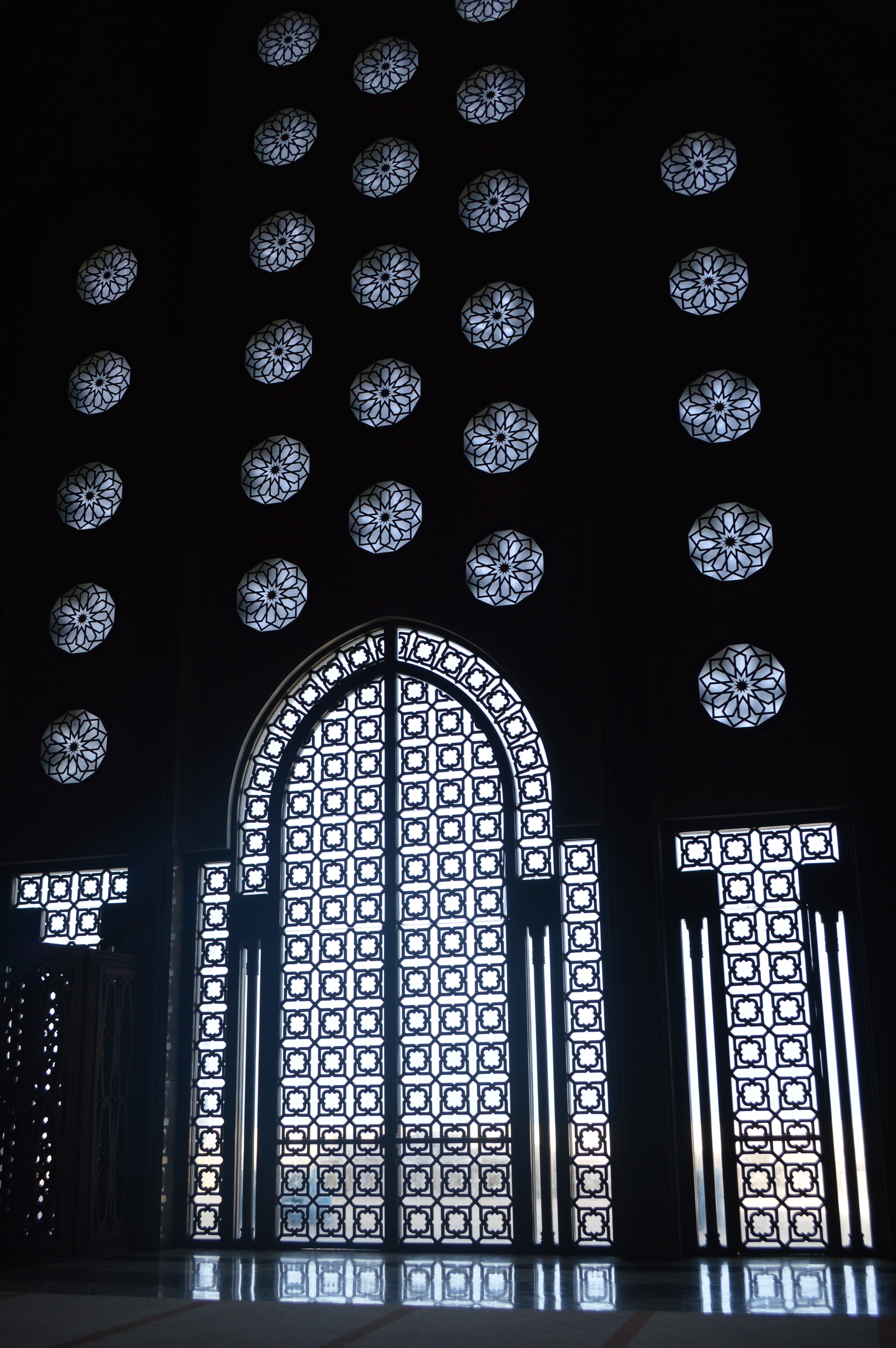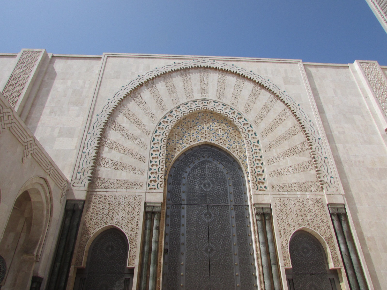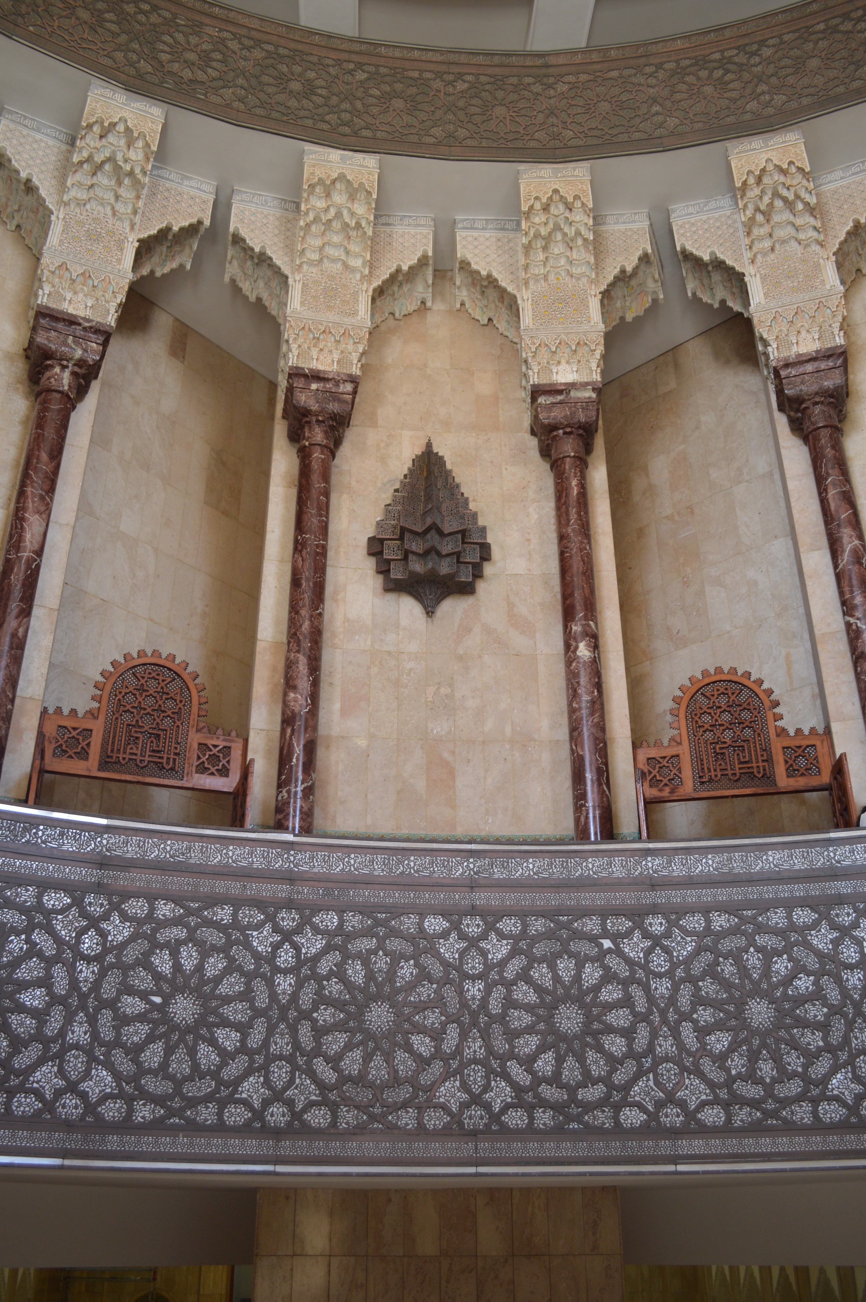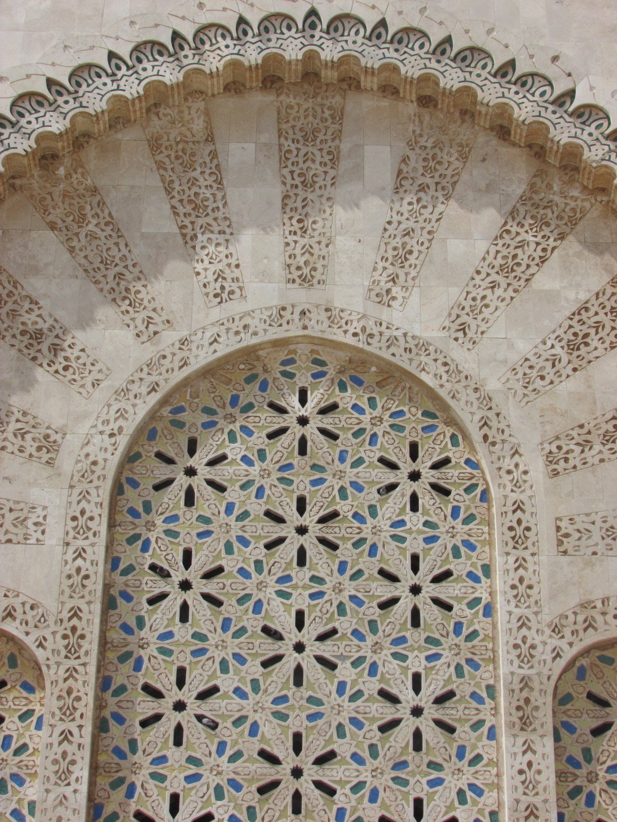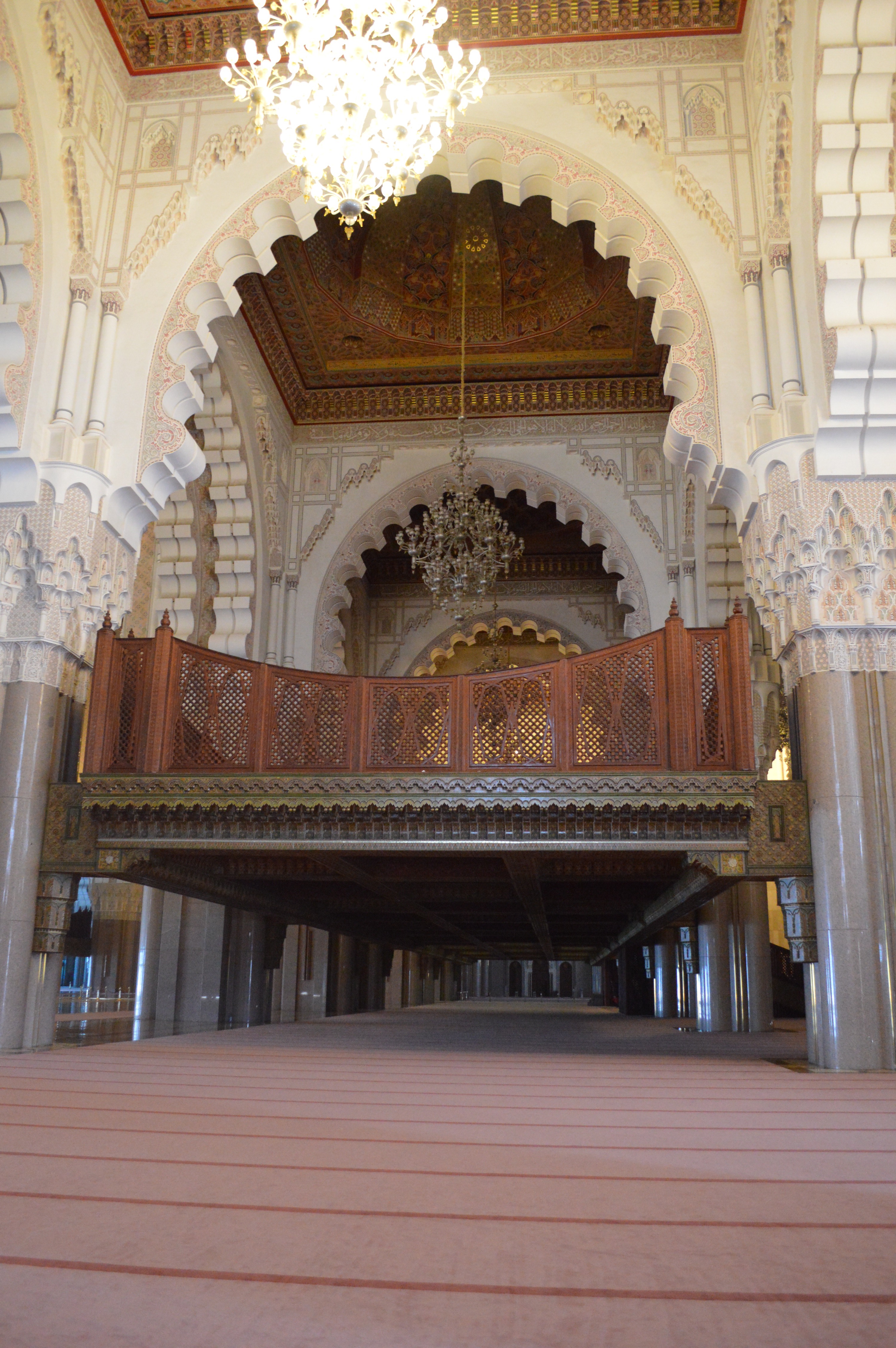 The Hassan II Mosque is the world’s third-largest mosque, the largest inMorocco, built to commemorate the former king’s 60th birthday. The mosque (and its 210m minaret) rises above the ocean on an outcrop northwest of the medina, and holds 25,000 worshippers and a further 80,000 in the squares around it. It is truly an impressive sight, such a large and decorated building with the ocean as a backdrop. We ran around trying to take it all in and snapping some beautiful photos long the way. To be able to see the stunning inside of the mosque you must go on a guided tour, so we headed in to meet our group. Awe-inspiring is the only was to describe it. There is so much detail everywhere that you look, it is hard to take it all in at once. As we walked around gawking at all the hand-made work and vast space, our guide told us details about the mosque and its operations. It was made in approximately 7 years, is estimated to have cost as much as $800 million, and around 1,400 men worked by day and 1,000 worked by night to bring the vast project to completion. There is an automated sliding roof opens (on special occasions) to the heavens (and the weather). Nearly all the materials of the Hassan II Mosque are from Morocco, with the sole exceptions of the imported white granite columns and glass chandeliers (from Murano, near Venice). The marble is from Agandir, the cedar wood is from the Middle Atlas and the granite comes from Tafraoute. Over 6,000 Moroccan master craftsmen and artisans were employed to work these local materials into the intricate decorations that embellish the entire structure.