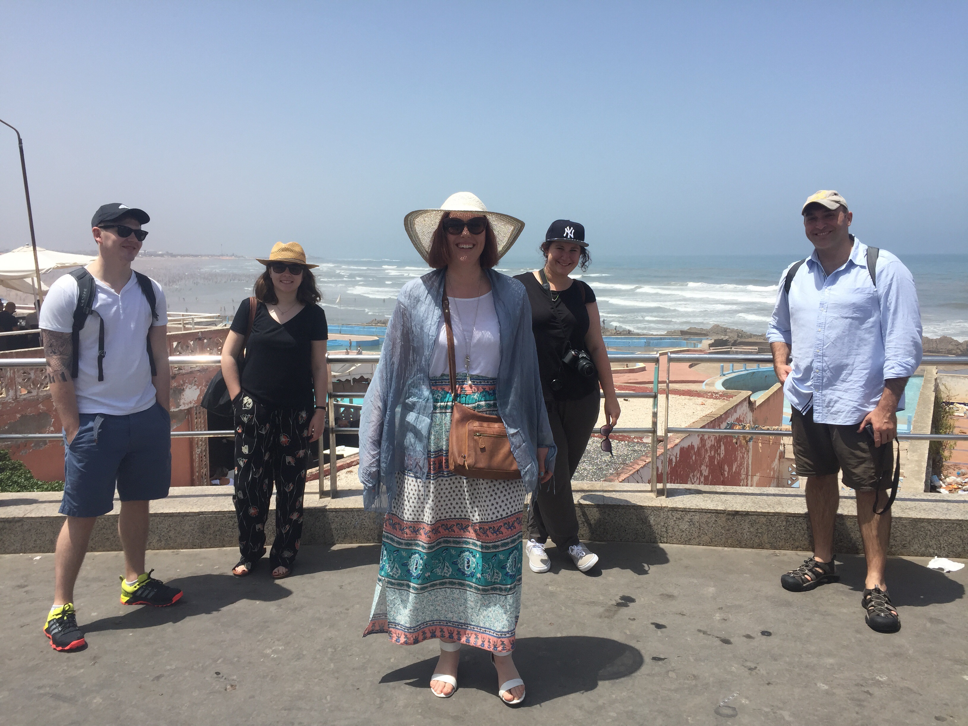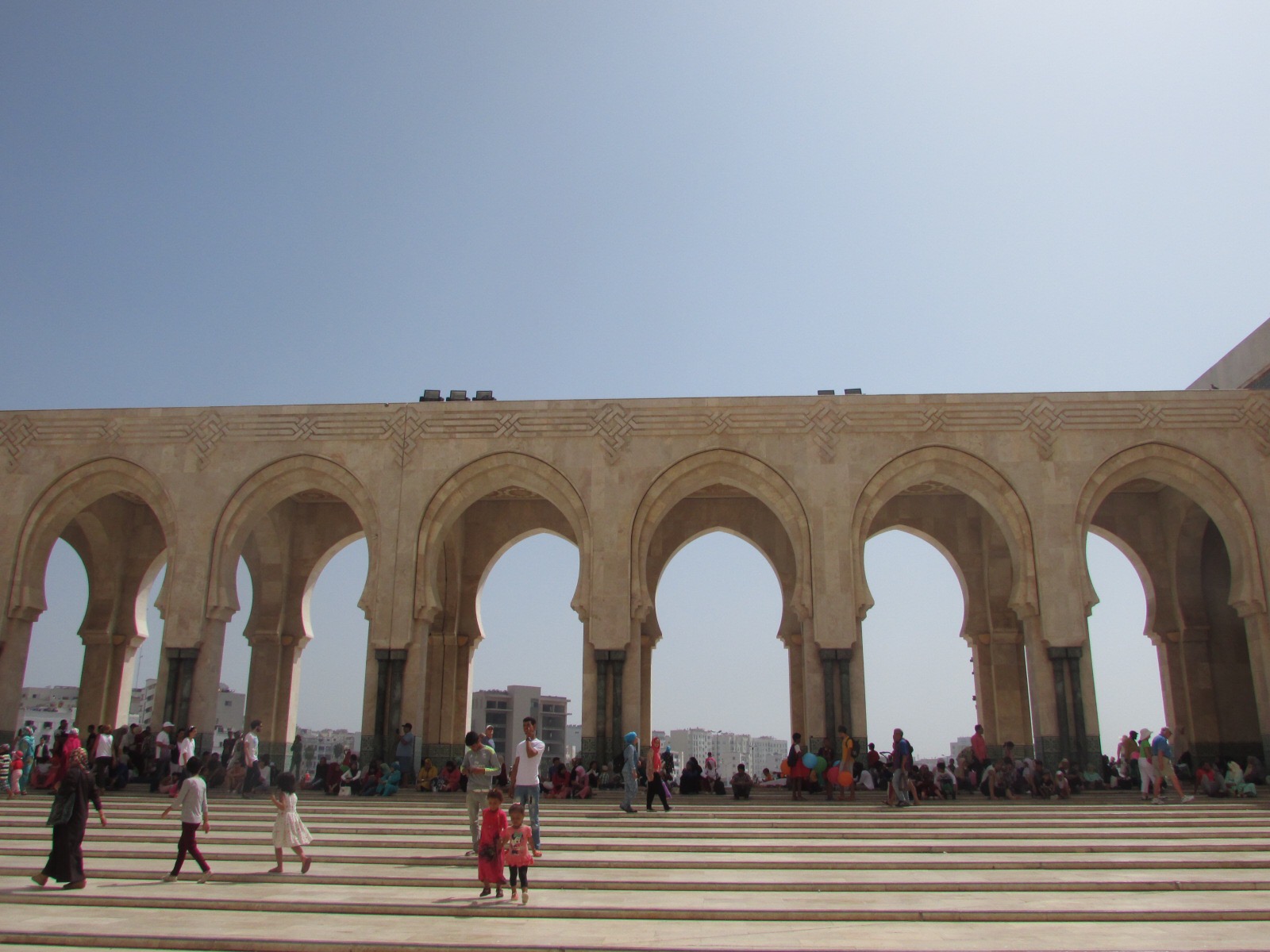 Where we walked was almost like a cliff high above the beach which was stretches of sand with swarms of people. At first we were not sure that all of the figures were people, we thought we must be seeing things due to the sheer volume. But no, everyone it seemed was soaking up the boiling sun at the beach! Walking around we were offered a variety of different things to purchase. The hardest people to say no to are always the children. Once we were about to melt from the heat we tried to find food. Mohamed recommended a restaurant and we enjoyed our meals and good conversation as we talked about why we decided to come to Morocco and what we were most excited about. Next we headed to the Hassan II Mosque.