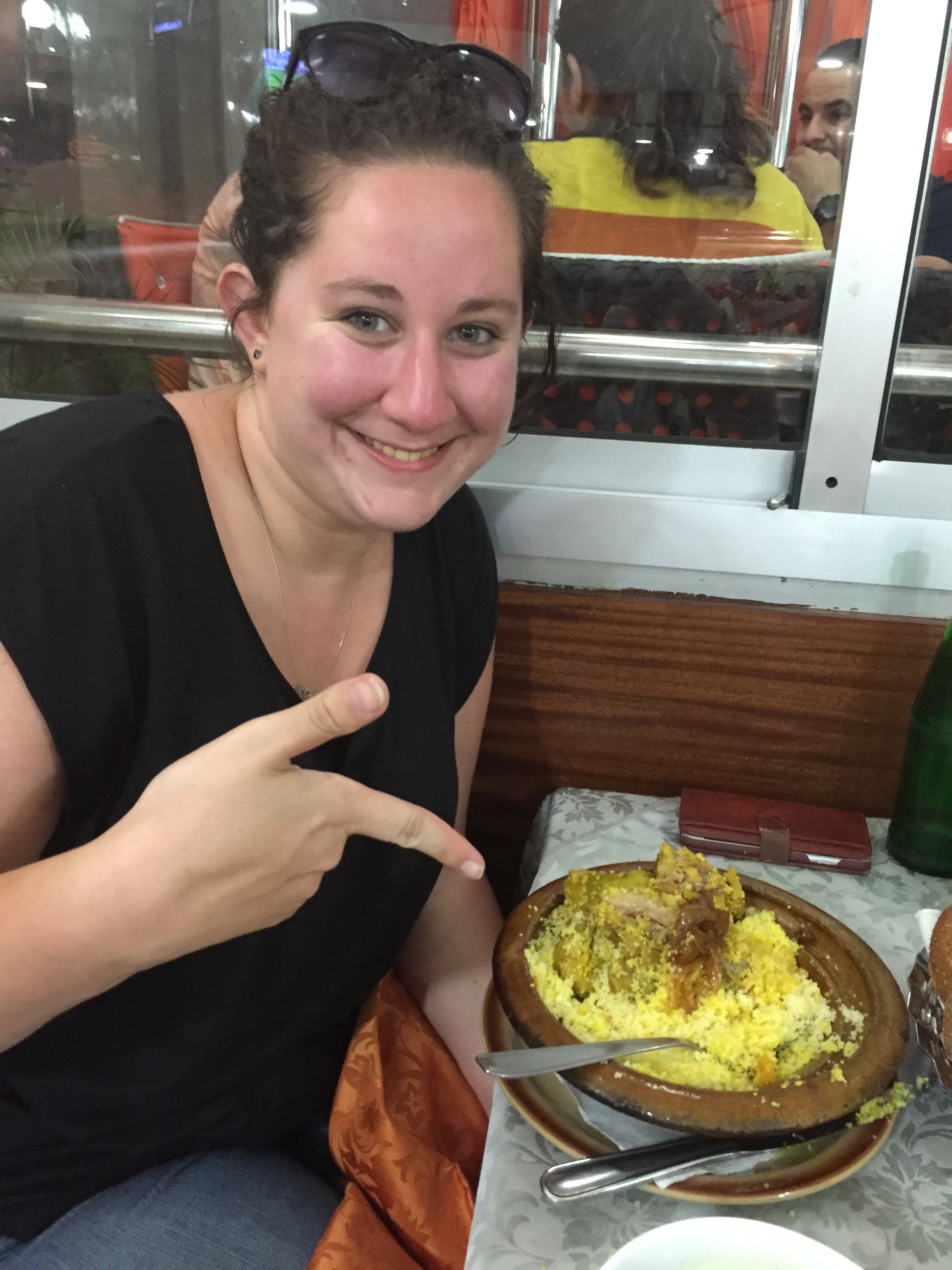 Once our tour of the mosque was finished, we headed to our hotel. The decorations were outstanding! Colour everywhere, all sorts of different patterns and styles that you didn’t think would/should match or go together at all but the Moroccan people sort of made this style work! My room was quite green and the girls had leopard print bedspreads! Madness. After relaxing for a bit we needed to refill our water supply and went off to find a supermarket. The funny bellhop (who had escorted us to our rooms and proceeded to explain how everything in our room worked in Arabic…) was downstairs and practically walked us down the street to the supermarket (how sweet! And a little odd). We saw a glimpse of the famous Casablanca tram (apparently the 4th best thing to do in Casablanca according to trip-advisor) and then went for a wander into town to find some dinner. This part of Casablanca seemed to be more of the run-down part. The suburb was quite bleak, either lots of the pavements and buildings unfinished/broken and a lots seemingly abandoned. We found a nice place for diner that Mohamed had again recommended and I enjoyed my first taste of “real” Moroccan food – couscous! It was delicious! We headed back to the hotel to settle in for the night as we had a big day of touring tomorrow. We didn’t really love Casablanca and would probably suggest to others – go for the mosque, then go somewhere else.