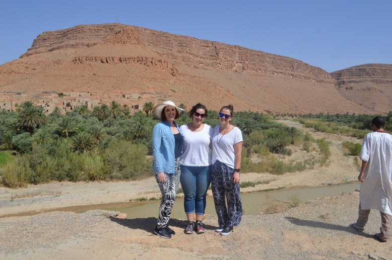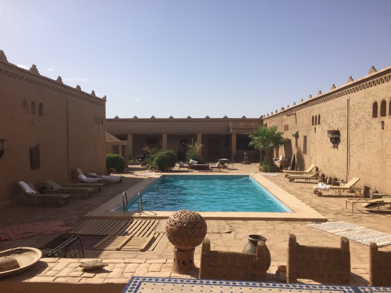 This morning we were super excited!! It had finally arrived – the day we were going to the dessert! Now I’m not going to lie, a few of us were not feeling our best (to say the least – Moroccan belly was starting to catch up with us) however we were still keen. Most of the morning was spent driving to our lunch destination. We drove to a hotel where we were designated to while away a few hours of the afternoon while we waited for the sun/heat to go down a little bit. The hotel itself was lovely – a great pool and a room where we could relax as well as a cute dining room. The food did look delicious, however not many of us ate much because of our tummies. I had about two spoonfuls and poor old Max had none. Those of us who could enjoyed some time in the pool, while the others tried to stay cool and feel less sick before jumping on a camel….