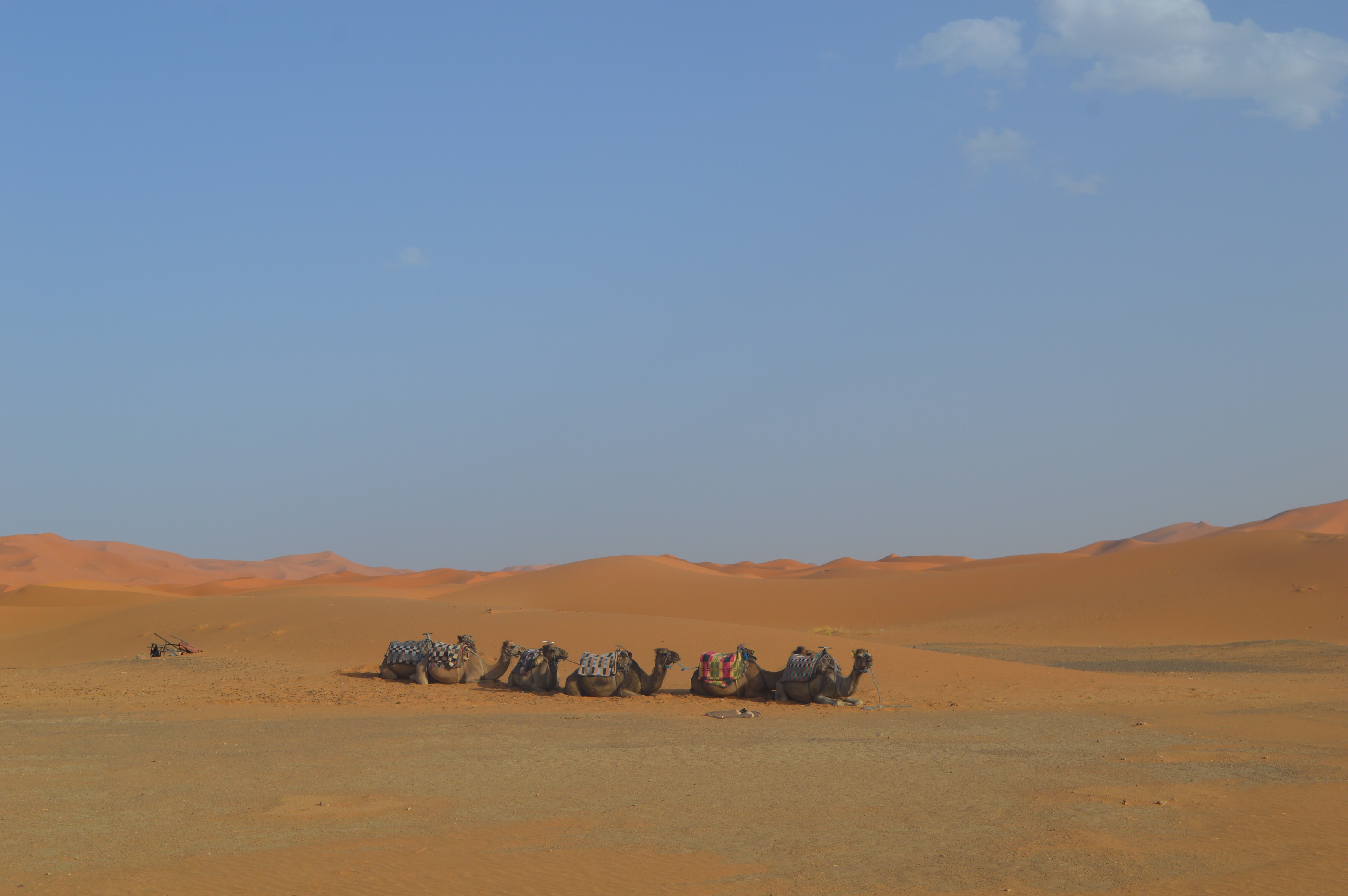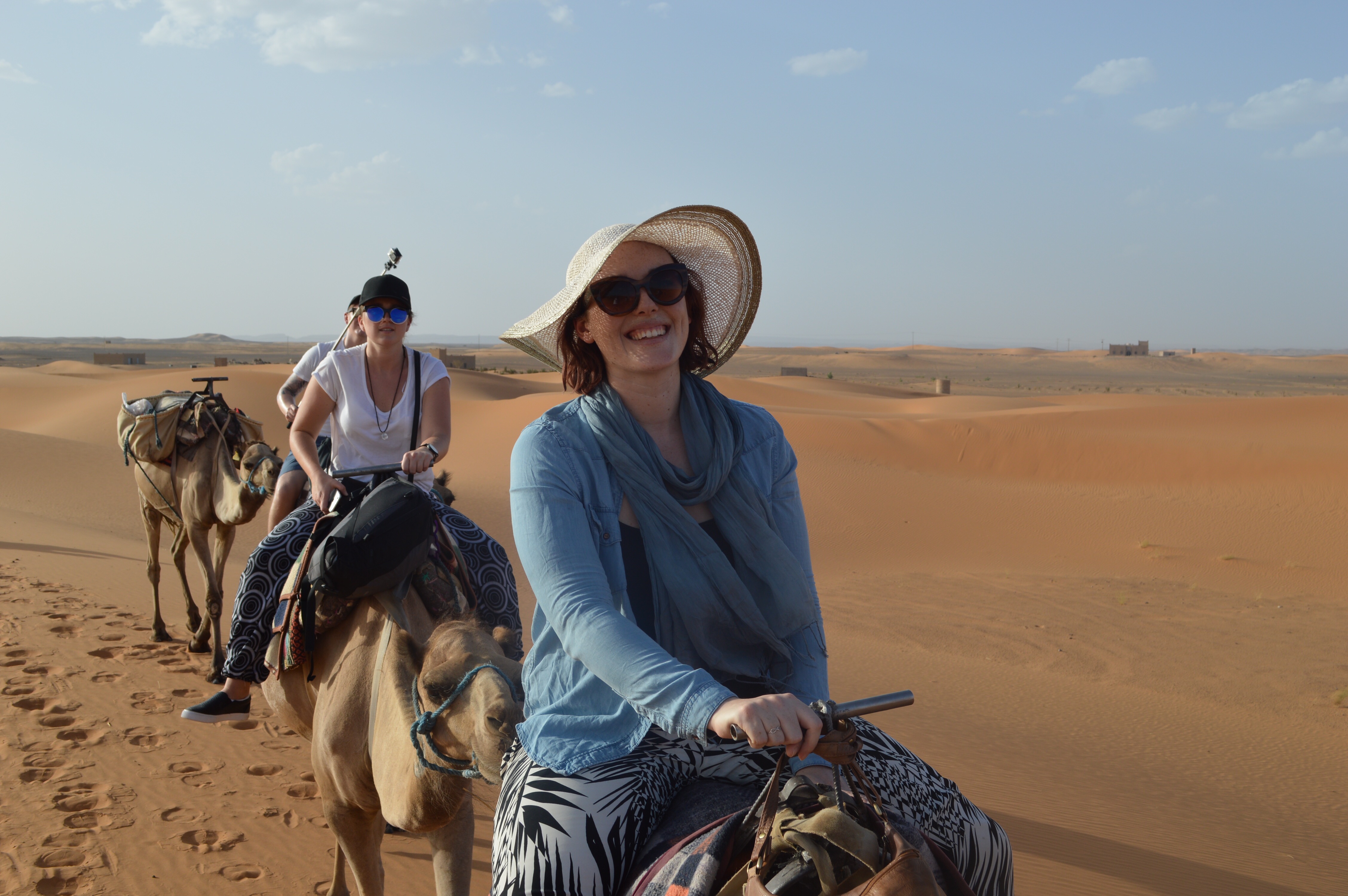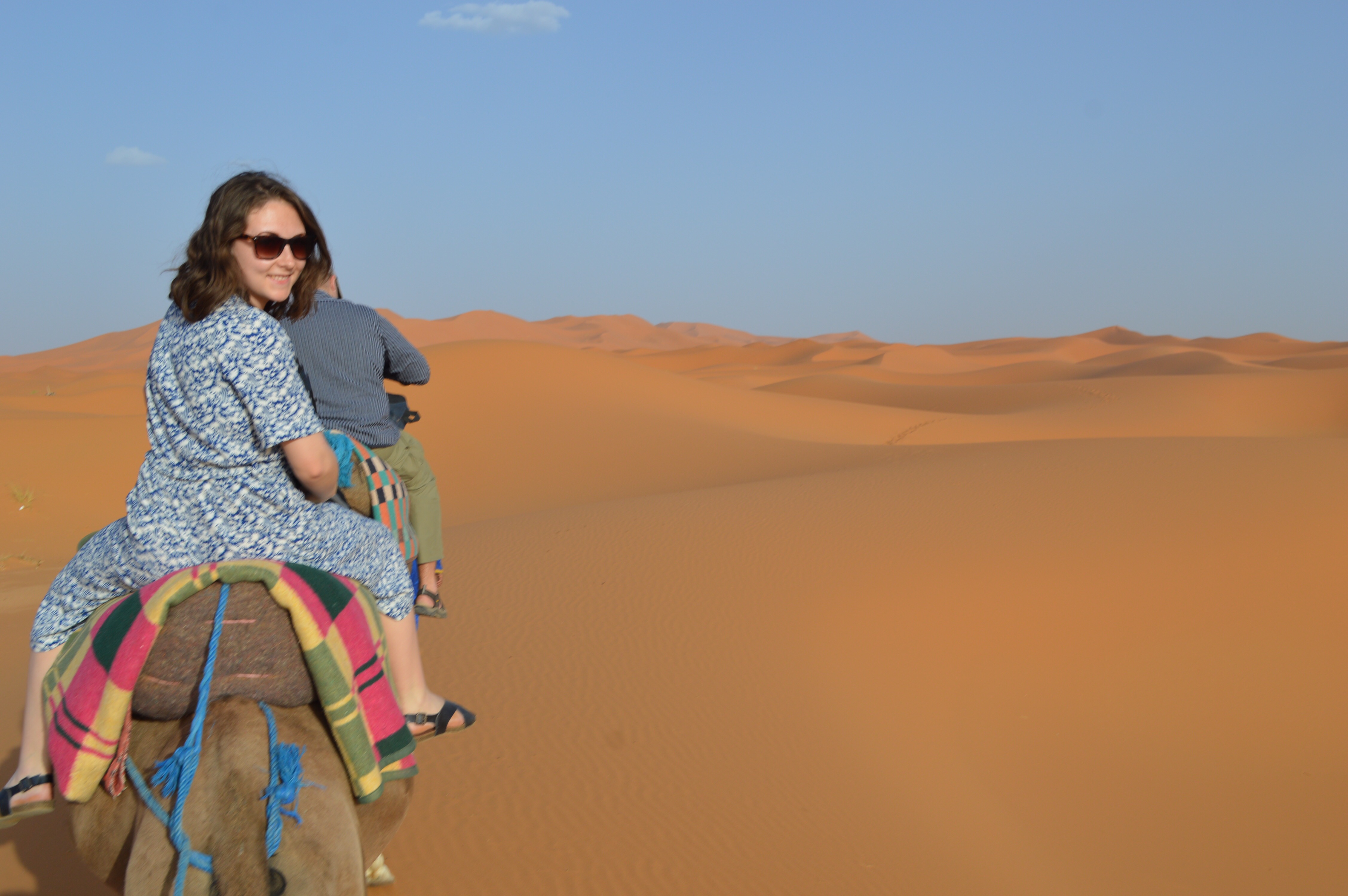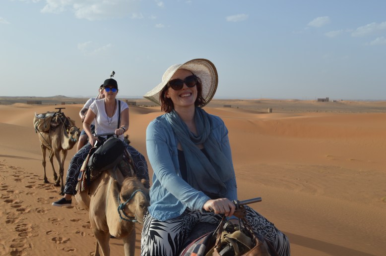 Finally we arrived at Merzouga – the base where we were going to swap Stan the Van for the camels! It was almost surreal with the sand dunes extending into the distance. We were introduced to our camels and our Berber guides helped us climb aboard (one of the strangest experiences I have had!). We had about an hour trek into the desert to make it to our Berber camp – it was a weird, wonderful, uncomfortable, hilarious and magical experience. The camel behind me had the snottiness nose I had ever seen and kept trying to wipe it on my leg (gross). Poor Max was moving all over the shop – really too sick to keep herself up on the camel. We went up and down dunes as our Berber guide led the camels further into the desert. Mohamed had joked that we better make sure we have our passports on us invade one of the camels took off and we ended up in Algeria…