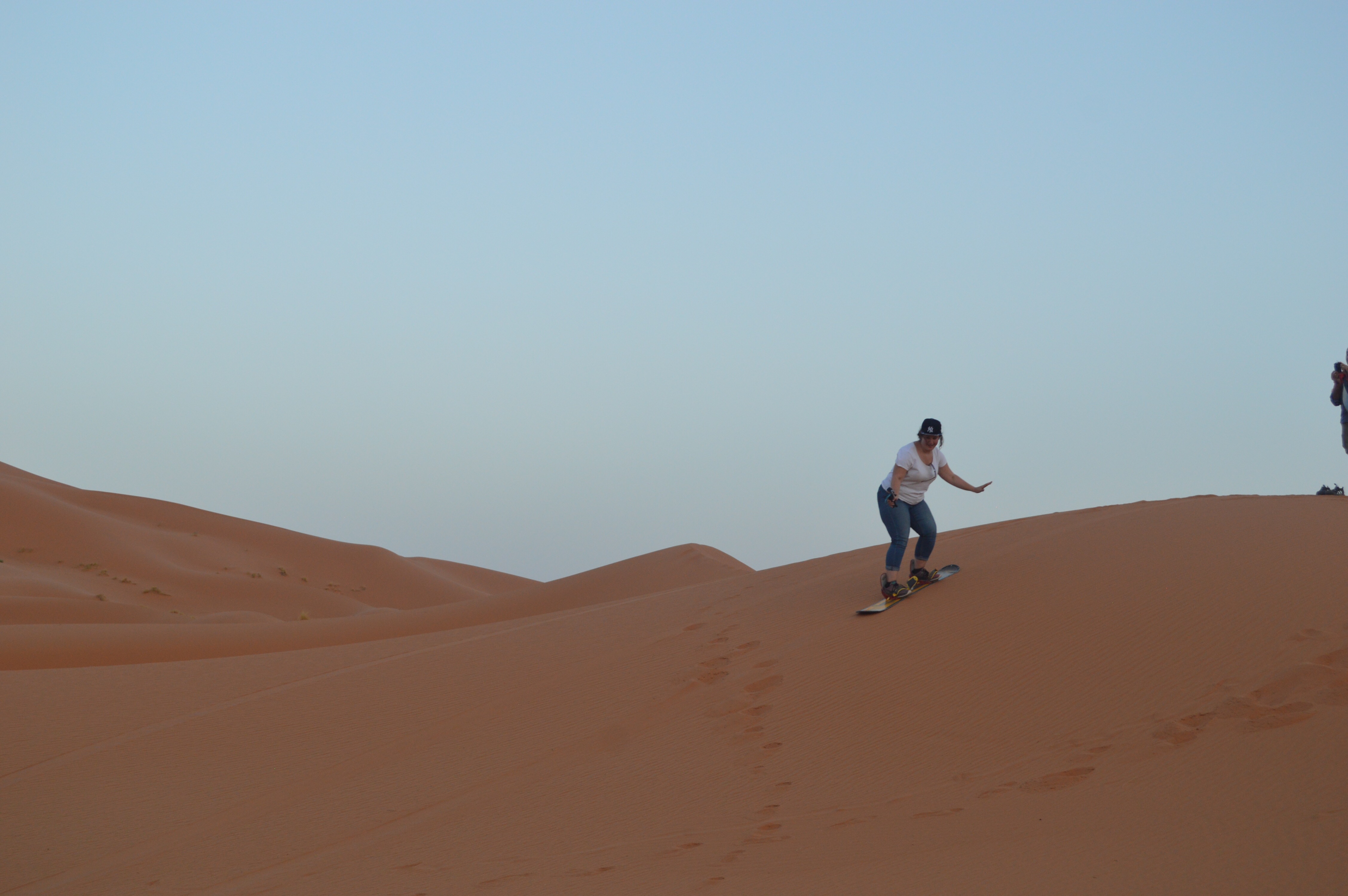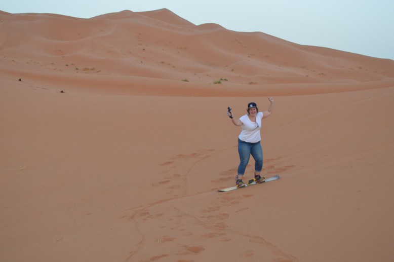 The camp itself was really quite good – a series of tents, as well as two toilets and a table with a few stools nestled in a small valley created by the dunes. Mohamed said we had a few hours before dinner and gave us some boards so we could go sand surfing. It was so fun! Some of the slopes were much slower than anticipated and some were much faster!