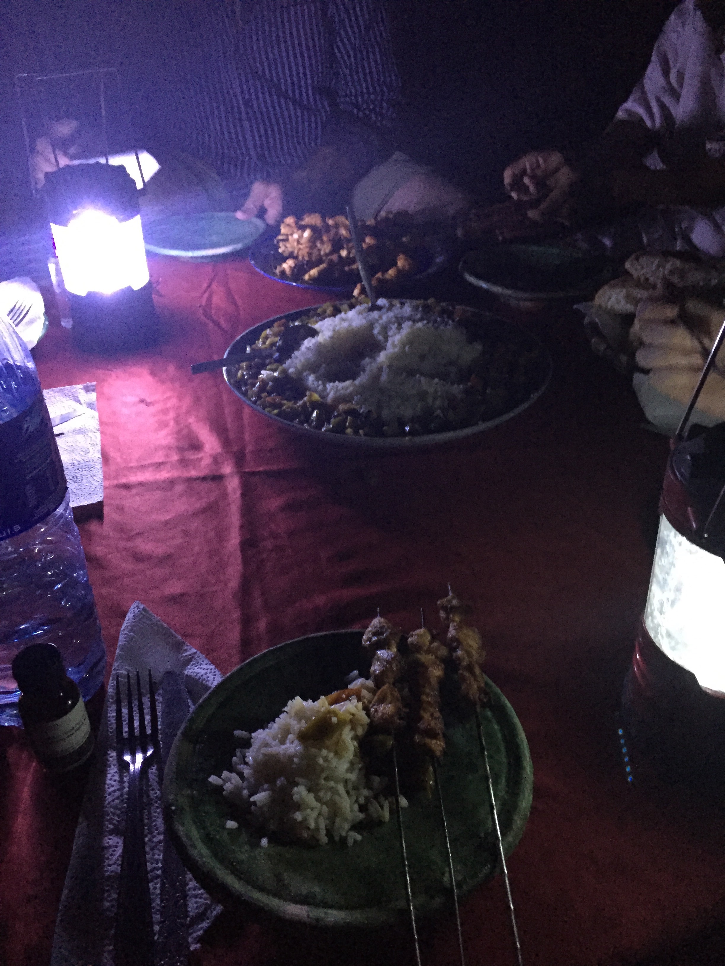 It was dark when we sat down for dinner. Mohamed and our Berber guides had cooked us a feast! We had a mix of salad things, rice and veggies and meat skewers. It was delicious. We lounged around for a while, eating and talking and then lying down on the mattresses that we had dragged out of the tents and stared up at the incredible stars.
