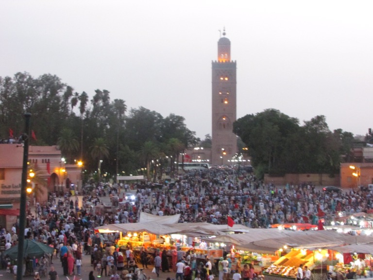 We dedicated a bit of time this afternoon for relaxing and swimming in the beautiful pool – the water was lovely and warm! We all met downstairs in the lobby to go into town together for dinner. We decided to head to the city’s UNESCO-listed medina and Djemâa-el-Fna. It is sort of like an open air theatre – drama and action in every corner. Snake charmers blast oboes to calm hissing cobras; henna tattoo artists beckon to passers by; water and orange juice-sellers in fringed hats clang brass cups together, hoping to drive people to drink; 100 chefs with grills in tow; musicians scattered everywhere and the odd monkey or two – an extraordinary gathering and market place. One of our tour mates even randomly had a snake put around his neck.