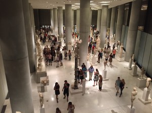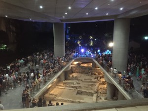 We were fortunate that our first night back in Athens just so happened to be the August Moon Festival. Every August on the night of the full moon, musical performances are held at key historic venues, including the Acropolis, the Roman Agora and other sites around Greece. So after we enjoyed far too much dinner (we always seem to over order/over estimate our hunger) we headed off in search of some fun! After a fell down a slippery cobbled street and grazed both my knees (how old am I? 12?) we saw some great street performers with a variety of different puppets and then we found live music in the gardens outside the the Acropolis Museum! We stood for a while and enjoyed the music (we could not see a thing because of the crowds) and did some serious people watching! There was every type of person – singles, couples, families, kids running around, elderly people sipping wine while sitting on the grass! It was all happening! After a while we ventured inside the museum because it was free! The Greeks really know how to celebrate a full moon!